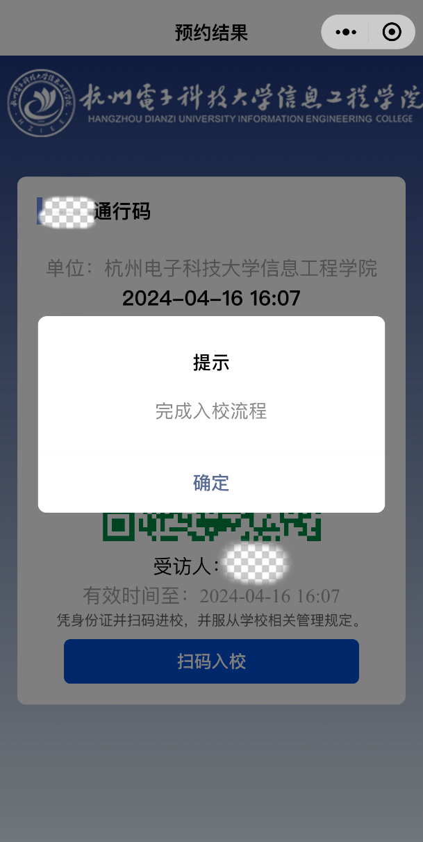 (4)在需要进入的校门门岗处扫描校门二维码,显示“完成入校流程”即可进校。