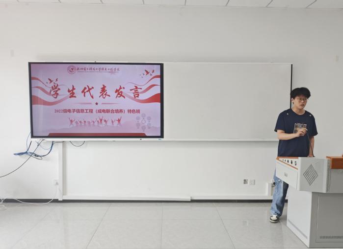 2022级优秀学生代表黄启恩同学上台发言,他分享了在成电班中的学习成长经历与收获感悟。黄启恩表示,在两校的悉心培养下,其专业知识与技能取得了长足的进步,更通过跨校协作实践锤炼了团队协作能力、拓展了全球化学术视野,激发了创新思维与学习热情,为未来的职业发展与学术研究奠定了坚实基础。