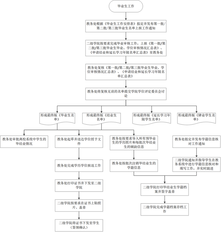 1.教务处根据《毕业生工作安排表》拟定并发布第一批/第二批/第三批毕业生名单上报工作通知。