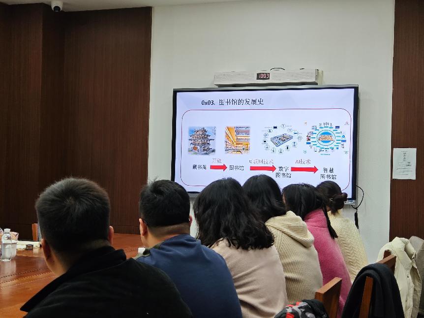 随后,徐明以“高校图书馆建设与发展思考”为主题,为与会人员带来了一场深入浅出、内容丰富的讲座。讲座中,徐明首先回顾了图书馆的发展史,从古代的藏书楼到现代的数字化图书馆,生动展现了图书馆在知识传承与文化交流中的重要作用。接着,他从思想、技术、现实层面剖析了当代图书馆所面临的挑战。