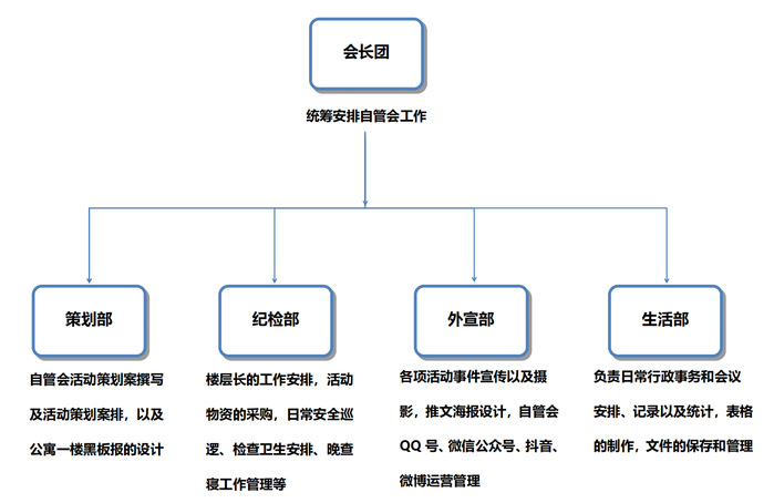 纪检部:纪检部作为自管会的重要组成部分,致力于维持寝室秩序、加强纪律监督。纪检部的主要工作包括进行卫生检查排表、物资采购与报销以及安排楼层长工作。纪检部的工作既需要饱满的热情,又需要细致的耐心。如果你有着奉献集体的意愿,又有着不怕麻烦的耐心,那么纪检部欢迎你的加入。