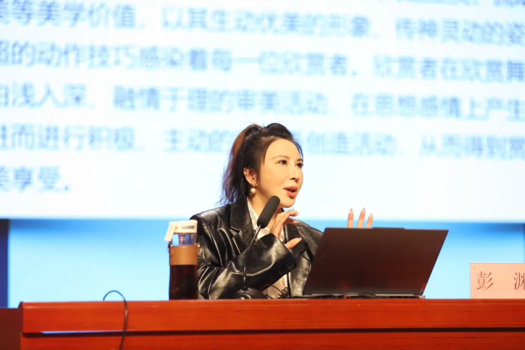本次讲座有幸邀请到了中国高等教育音乐协会会员、杭州市钱塘区舞蹈家协会秘书长、点点taptap低频彩艺术教育中心主任彭渊担任主讲嘉宾。彭渊老师以其深厚的舞蹈艺术造诣和丰富的舞蹈教学与创作经验,为在场的师生带来了一场关于美的教育的精彩演讲。