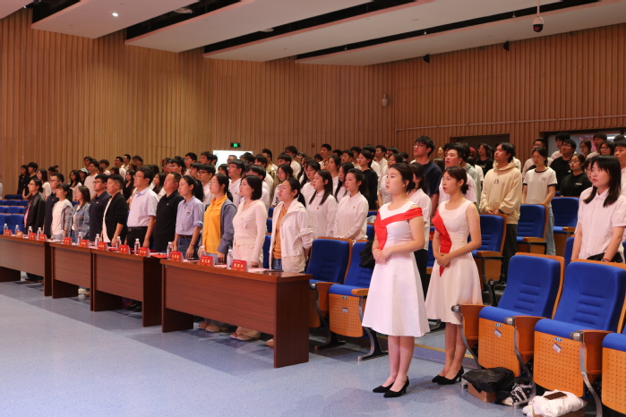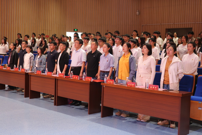 随后优秀团员代表袁琪儿同学带领新团员们在团旗下庄严宣誓。各位团员必将时刻铭记入团初心,坚定共产主义远大理想和中国特色社会主义共同理想,将誓词镌刻在心里、落实到行动上。